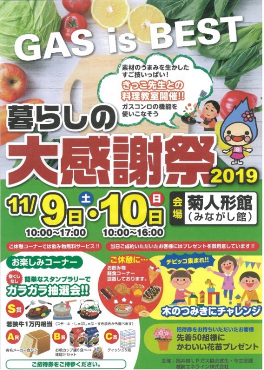 最新ガス機器を会場に多数展示!このセールだけの超特価品も♪ 他にも、招待券をお持ちの方へのご来場記念品をはじめ、料理教室や木のつみきコーナーなど、イベント盛りだくさん! 皆様のご来場を心よりお待ちしております。