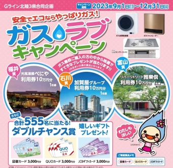 キャンペーン期間中、Gライン加盟店でガス機器をご購入いただいた方に、抽選でステキなプレゼントが当たります。 福井県から応募の方は福井賞(光風湯圃べにや)が当たります。また、ダブルチャンス賞から1点お好きな賞品をお選びください。